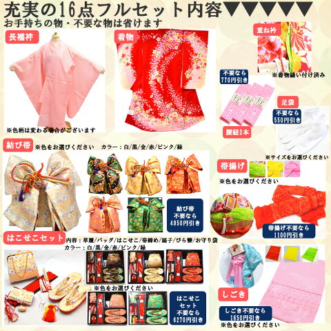 ◆素材 四つ身着物:表 正絹 裏 ポリエステル 長襦袢:ポリエステル 結び帯はこせこセット:ポリエステル等 帯揚:ポリエステル(追加料金で正絹に変更可) しごき:ポリエステル(追加料金で正絹に変更可) 足袋:ナイロン 腰紐:毛 ◆カラー 赤 クリーム 黒 白 ◆内容 着物(四つ身)・重ね衿・長襦袢・御祝帯・草履・バッグ・丸ぐけ・はこせこ・扇子・びらかんざし・帯揚げ・しごき・足袋(ストレッチタイプのソックス型)・腰紐3本 ◆注意 ・システム上カート内で追加購入商品の金額が反映されません。